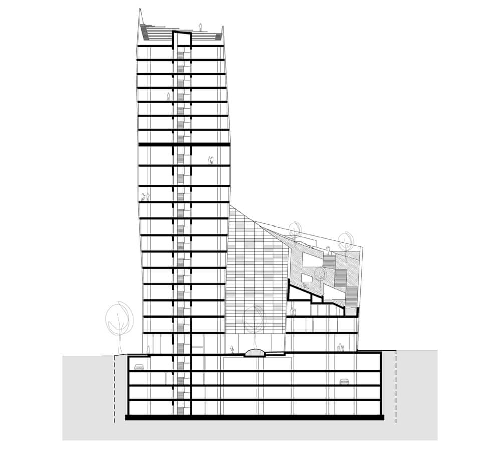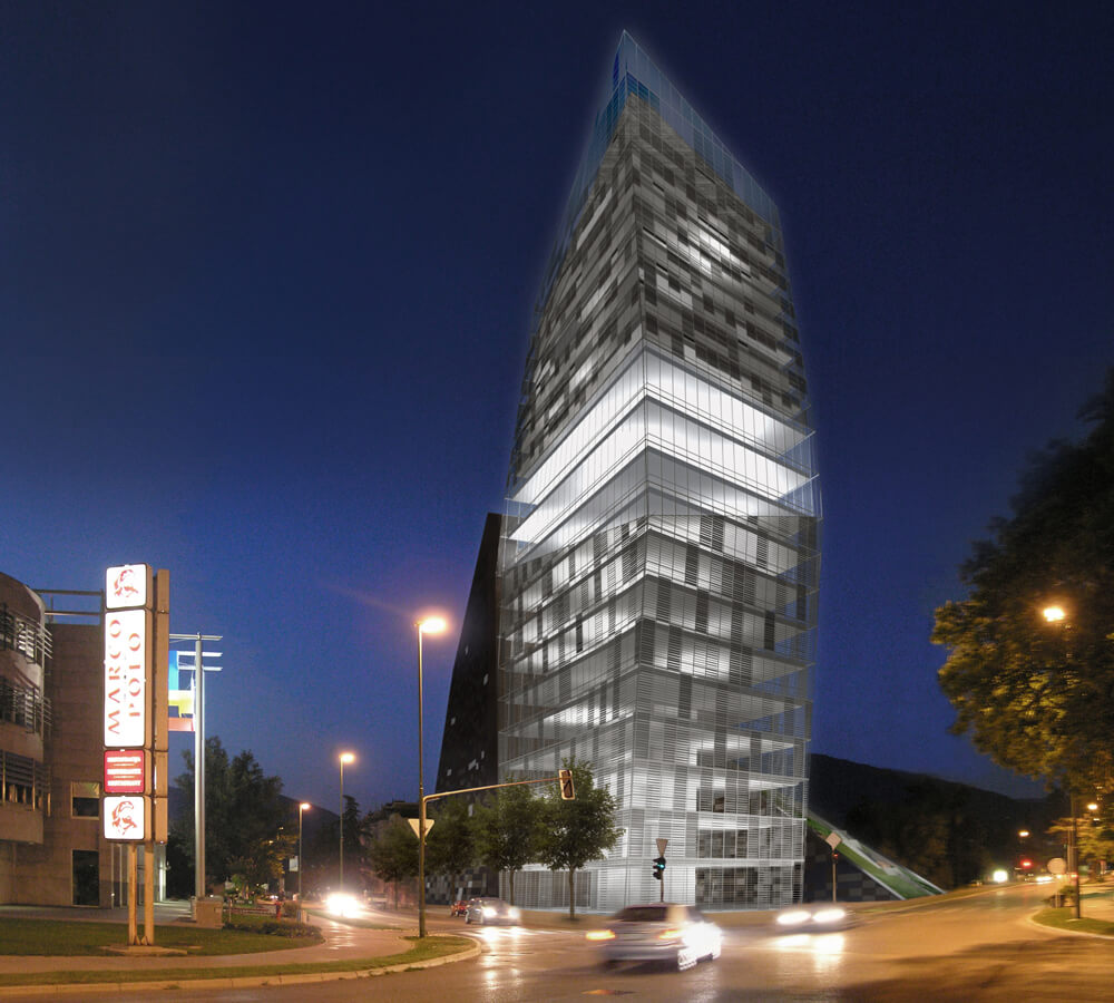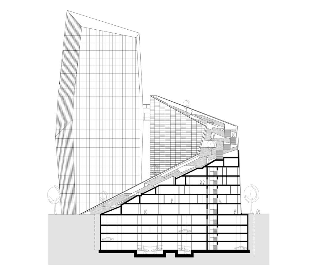 Program je zelo mešan in zgoščen. Na parceli velikosti 4.125 m2 se zahteva 20.000 m2 programa (FSI=4,8) ter 4 etaže kleti s 400 parkirnimi mesti; objekt združuje državno upravo, poslovne prostore, stanovanja, restavracijo, enoteko, galerijo, kavarno in lokale. Pod zemljo so štiri etaže za 395 parkirnih mest, objekt sega 77 m v višino.