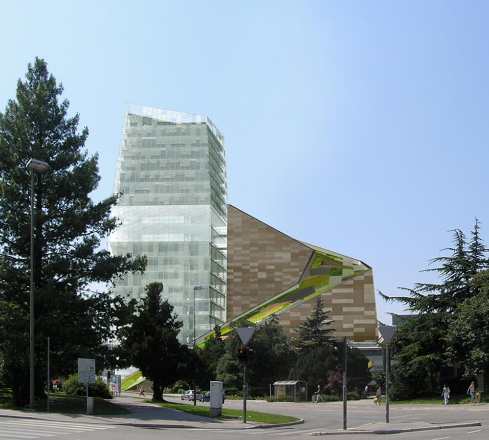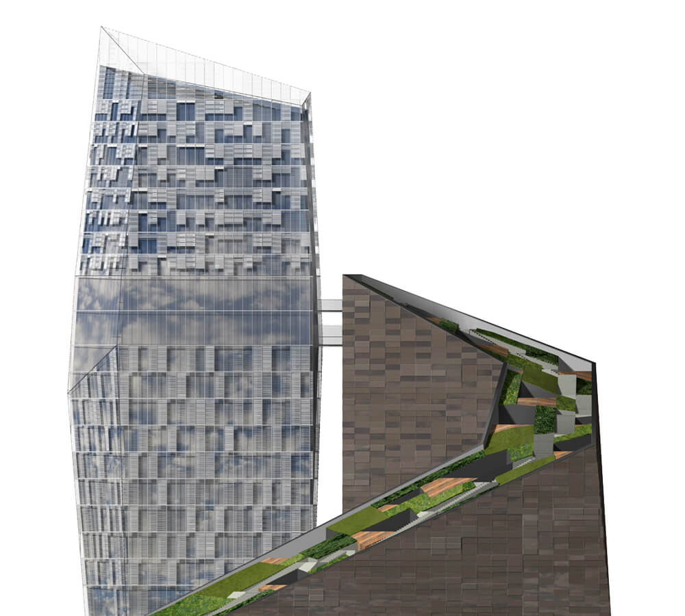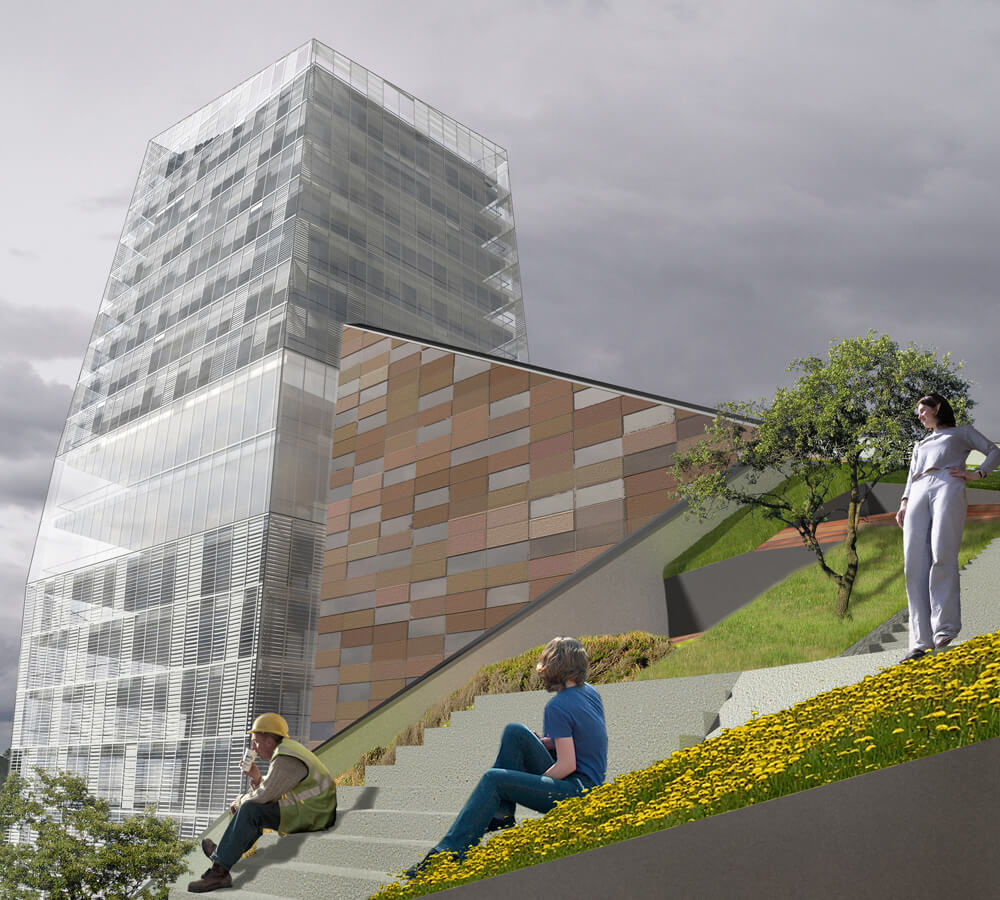 Predlagamo javno, pohodno zazelenjeno streho (umetni grič), ki obiskovalcem omogoča razgledni sprehod do enoteke in restavracije v 10. in 11. nadstropju stolpnice. S tem dosežemo, da je celotna površina javnega prostora enaka površini parcele in ravninskemu mestu ustvarimo pohodni grič. Prav tako stolpnica predvideva razgledno ploščad na vrhu, ki je lahko zasebna, poljavna ali javna. Njena zasnova omogoča tudi ureditev manjšega avditorija na prostem.