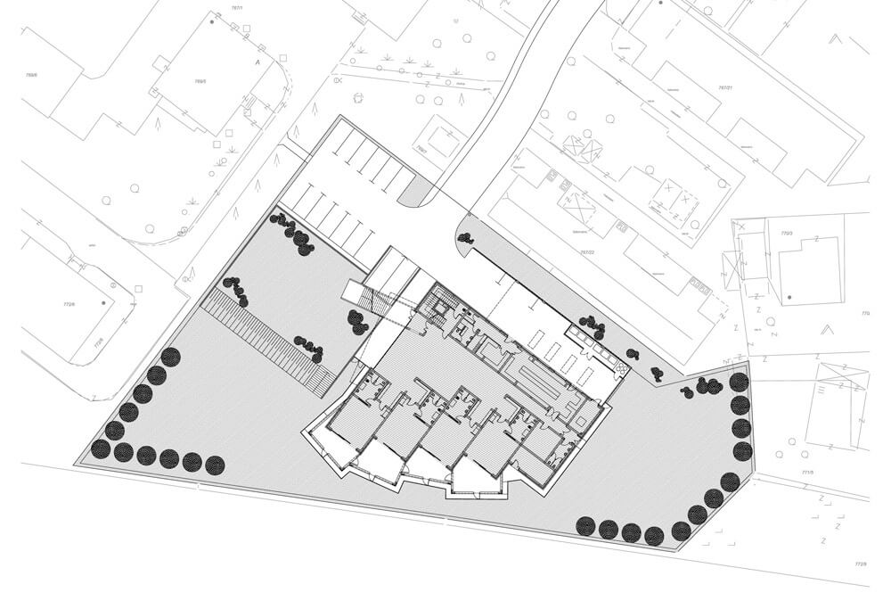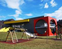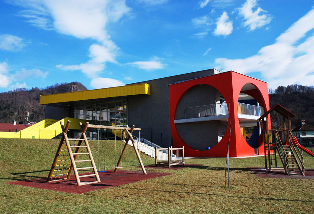 Dvonadstropni vrtec ima po 4 oddelke v vsakem nadstropju (skupaj cca. 80-90 otrok). V razgibanih barvnih kubusih so terase igralnic. Nadstropni del je povezan z zunanjim igriščem z zunanjimi stopnicami preko zazelenjene strehe vkopane garaže.