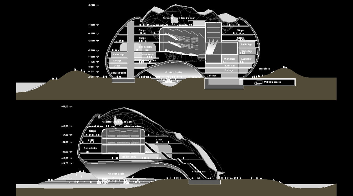 Kaj opera dela? Izkušnja operne predstave nas transcendira iz materialnega sveta. Operna hiša naj ne bo formalni jezik, niti odziv na kontekst, ampak naj bo transcendentna in dematerializirana in naj lebdi nad vodo v svoji idealni formi. Po drugi strani pa naj bo njen obraz kot zamrznjena glasba, ki prebudi teatraličnost in nas povabi vase.